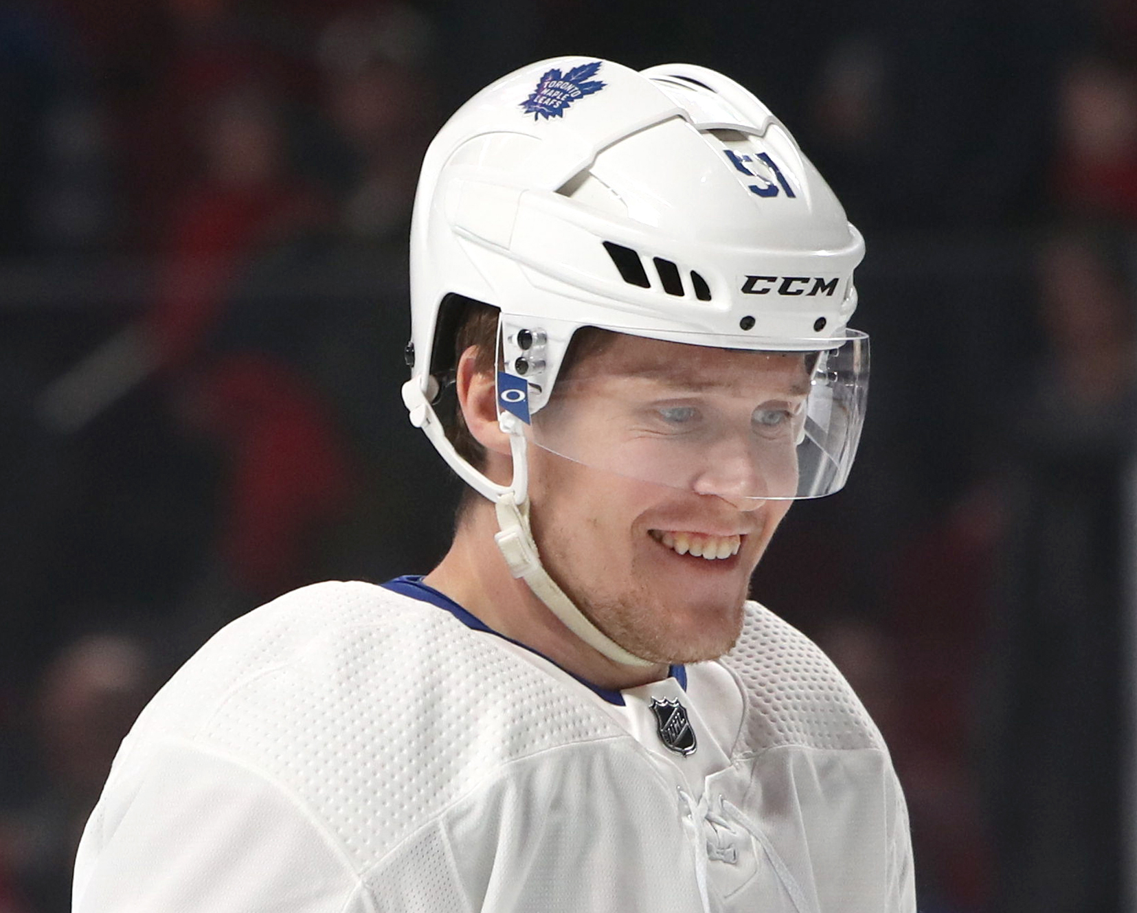 Apr 6, 2019; Montreal, Quebec, CAN; Toronto Maple Leafs defenseman Jake Gardiner (51) looks on during the warm-up session before a game against the Montreal Canadiens at Bell Centre. Mandatory Credit: Jean-Yves Ahern-USA TODAY Sports[/caption]