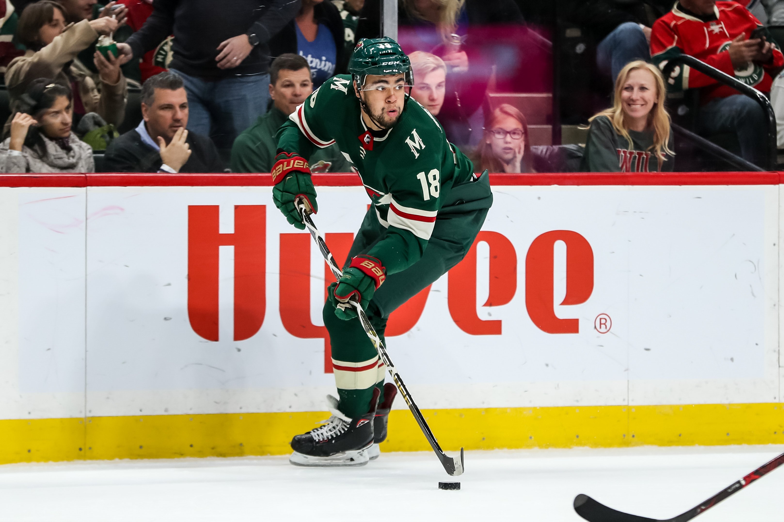 Oct 20, 2018; Saint Paul, MN, USA; Minnesota Wild forward Jordan Greenway (18) during a game between the Tampa Bay Lightning and Minnesota Wild at Xcel Energy Center. Mandatory Credit: Brace Hemmelgarn-USA TODAY Sports[/caption]