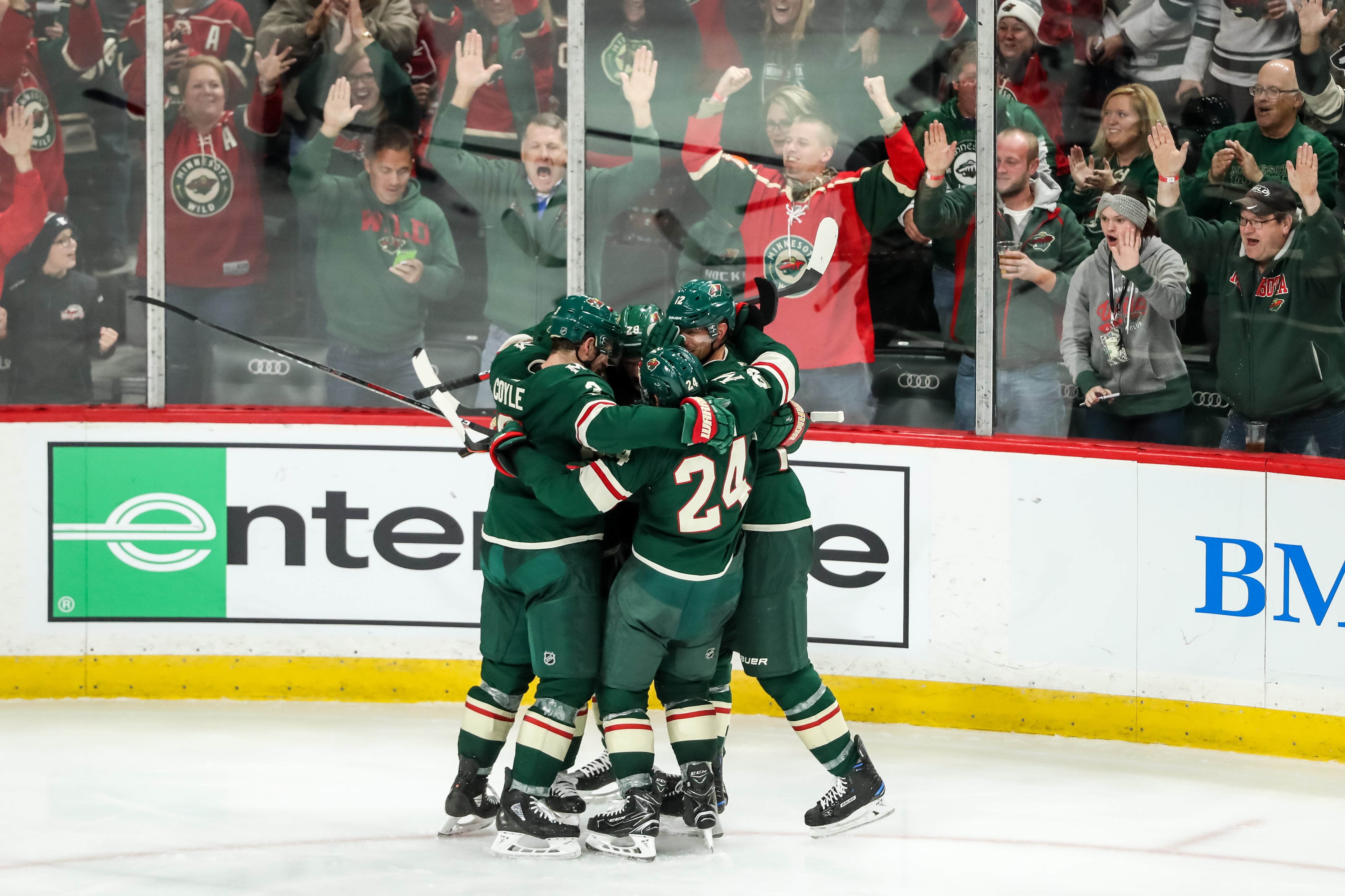 Oct 16, 2018; Saint Paul, MN, USA; Minnesota Wild forward Eric Staal (12) celebrates his goal with teammates during the third period against the Arizona Coyotes at Xcel Energy Center. Mandatory Credit: Brace Hemmelgarn-USA TODAY Sports[/caption]