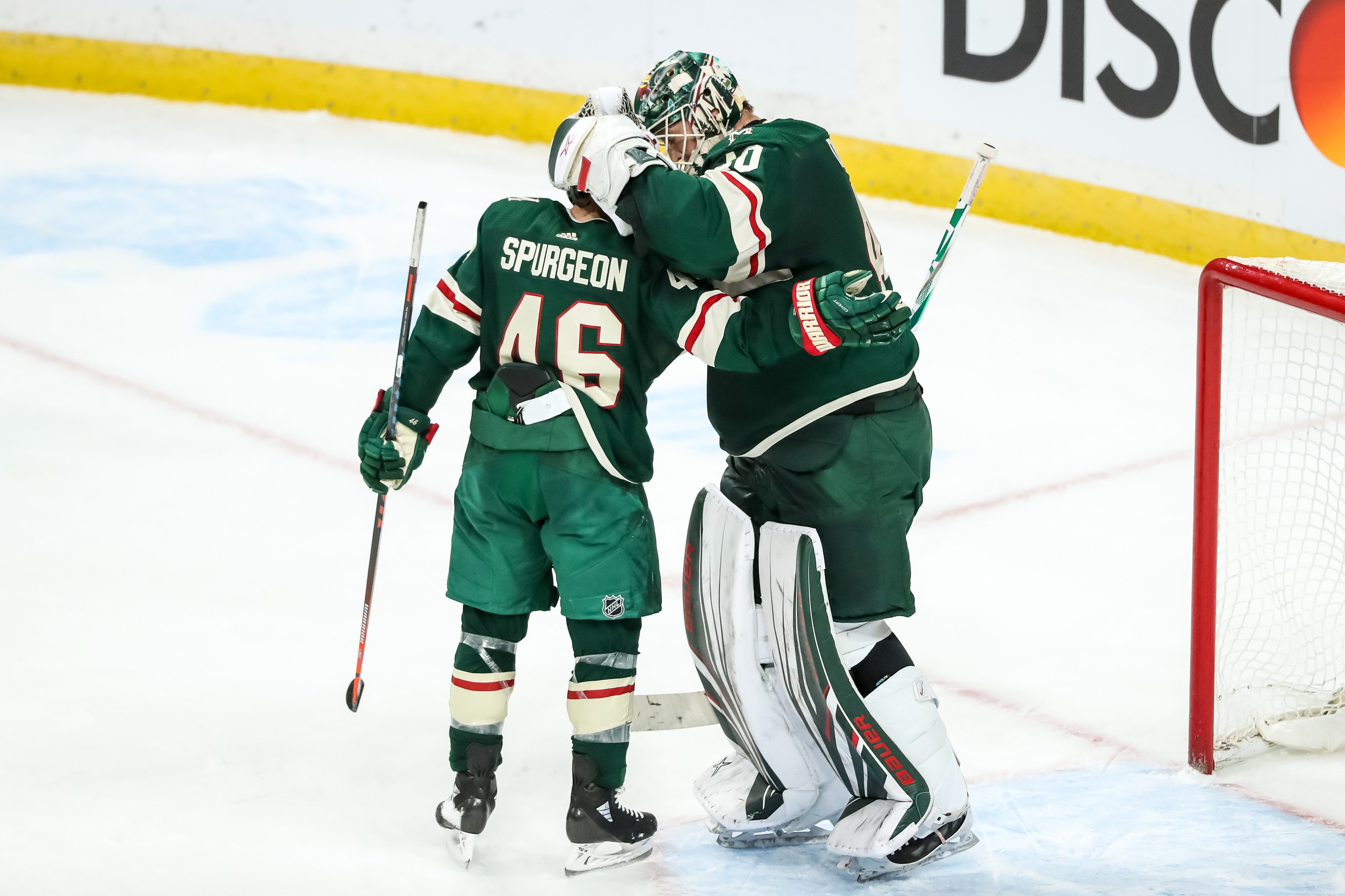 Oct 16, 2018; Saint Paul, MN, USA; Minnesota Wild defenseman Jared Spurgeon (46) celebrates with goalie Devan Dubnyk (40) during the third period against the Arizona Coyotes at Xcel Energy Center. Mandatory Credit: Brace Hemmelgarn-USA TODAY Sports[/caption]